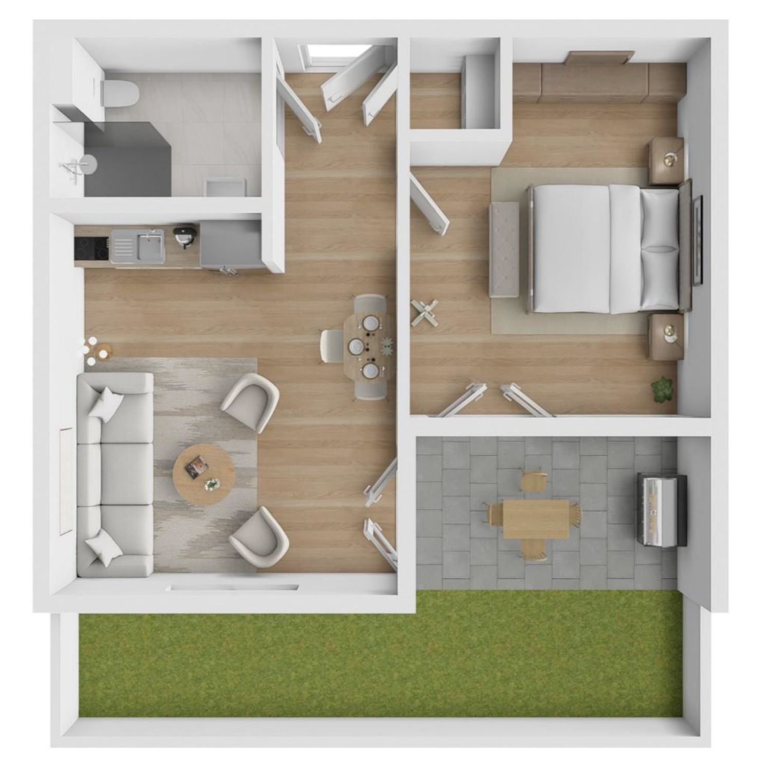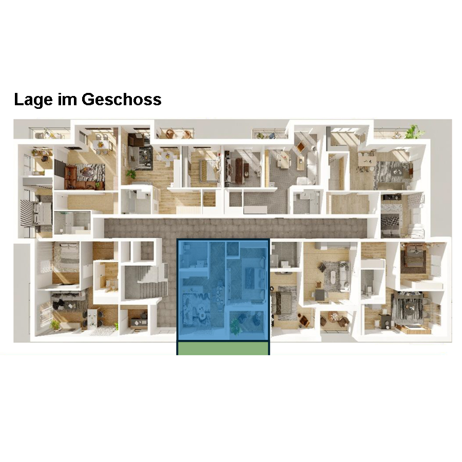 Die Wohnung (WE 20) besticht durch praktische Aufteilung und einen großen Garten mit über 15 m² Grünfläche. Die Wohnfläche beträgt 55,41 m².