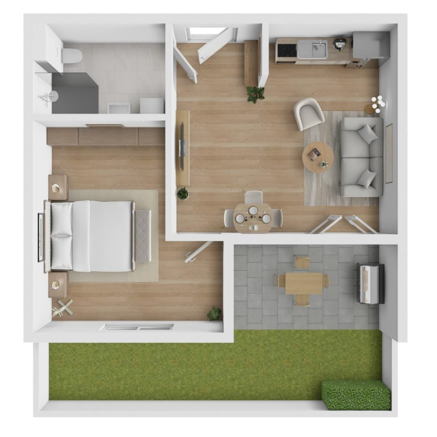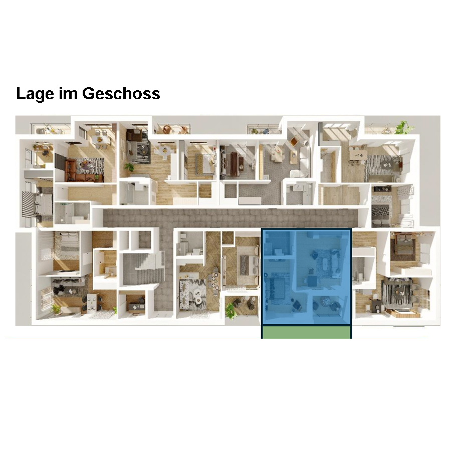 Die Wohnung (WE 22) besticht durch praktische Aufteilung und einen großen Garten mit über 15 m² Grünfläche. Die Wohnfläche beträgt 55,63 m².
