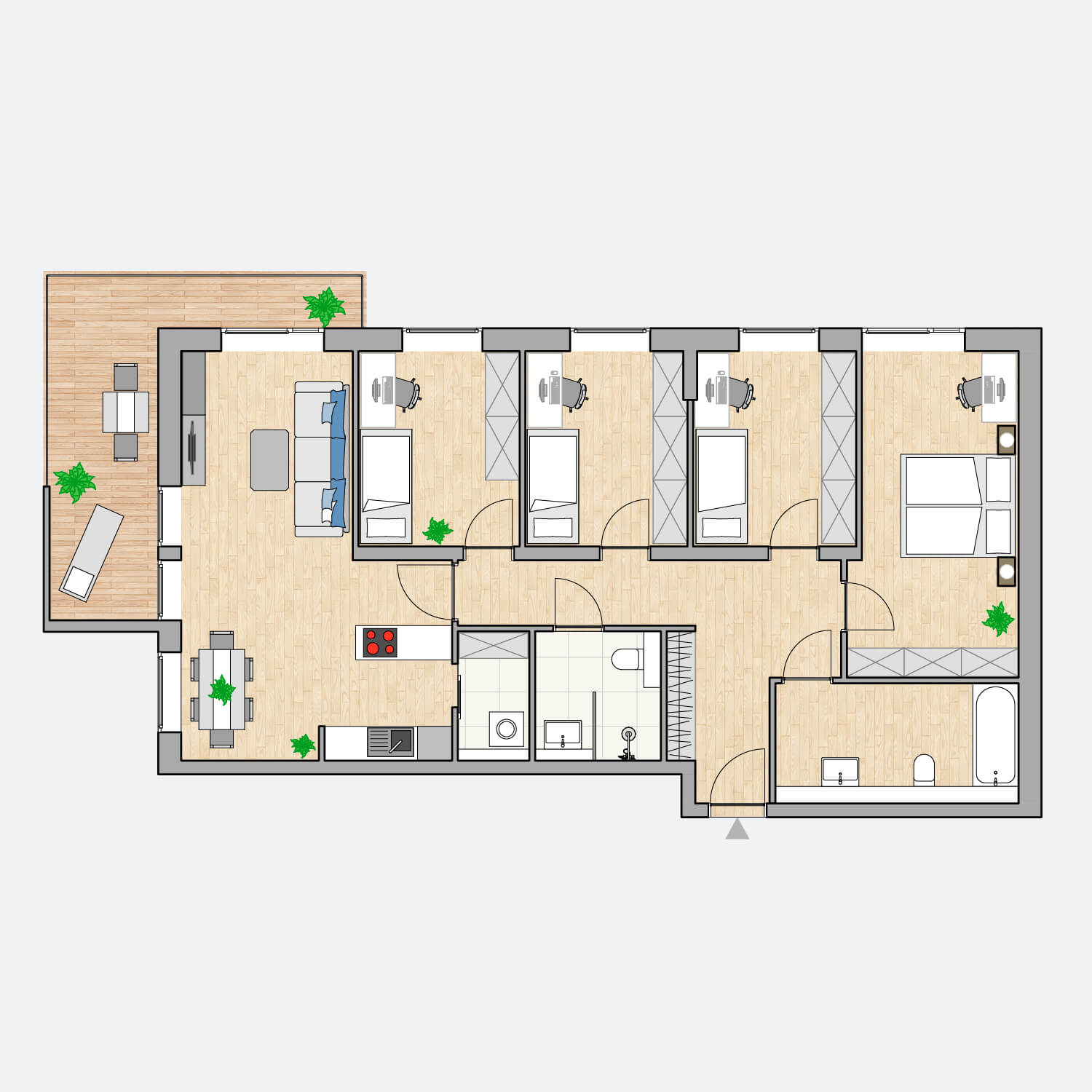 Insgesamt präsentiert sich die Wohnung als ein großzügiges und familienfreundliches Zuhause mit einer ausgewogenen Mischung aus privaten Rückzugsorten und gemeinschaftlichen Bereichen. Der Balkon und die gut durchdachte Raumaufteilung tragen zu einem komfortablen und zeitgemäßen Wohnkonzept bei.
