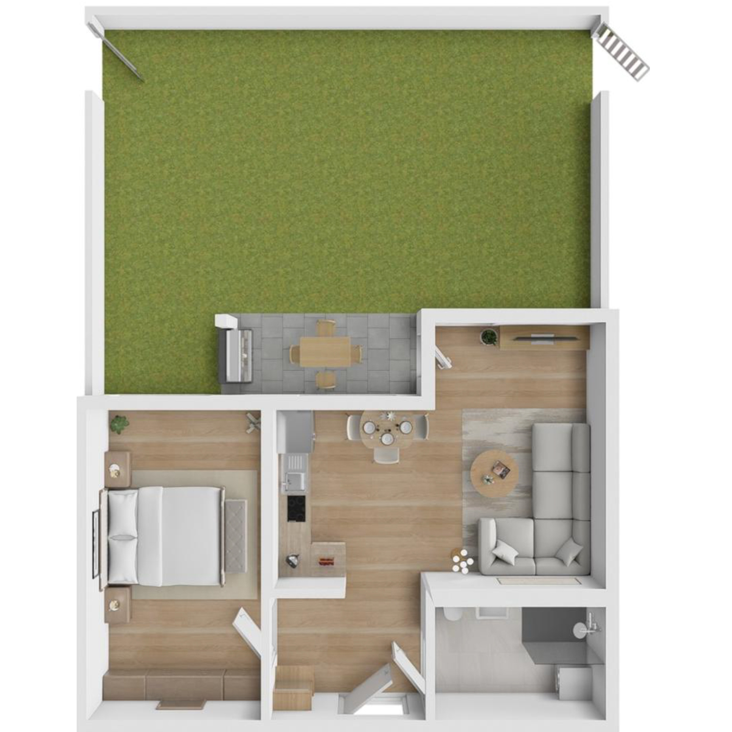 Die Wohnung (WE 21) besticht durch praktische Aufteilung und einen großen Garten mit über 50 m² Grünfläche. Die Wohnfläche beträgt 53,37 m².
