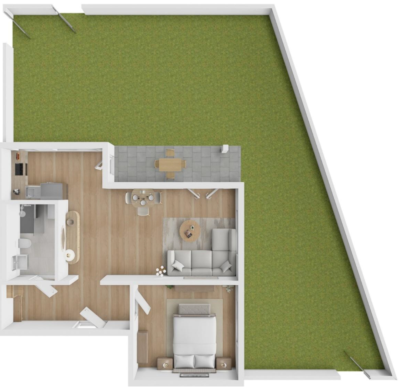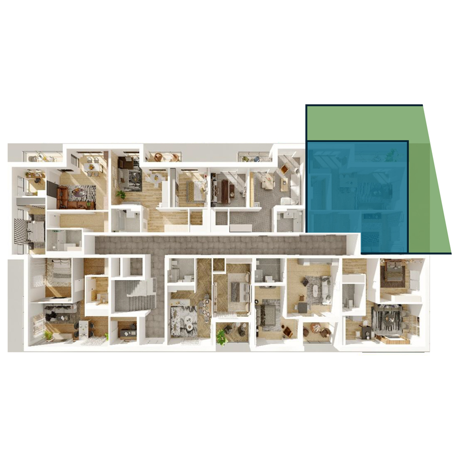 Die Wohnung (WE 23) besticht durch praktische Aufteilung und einen großen Garten mit über 100 m² Grünfläche. Die Wohnfläche beträgt 67,22 m².