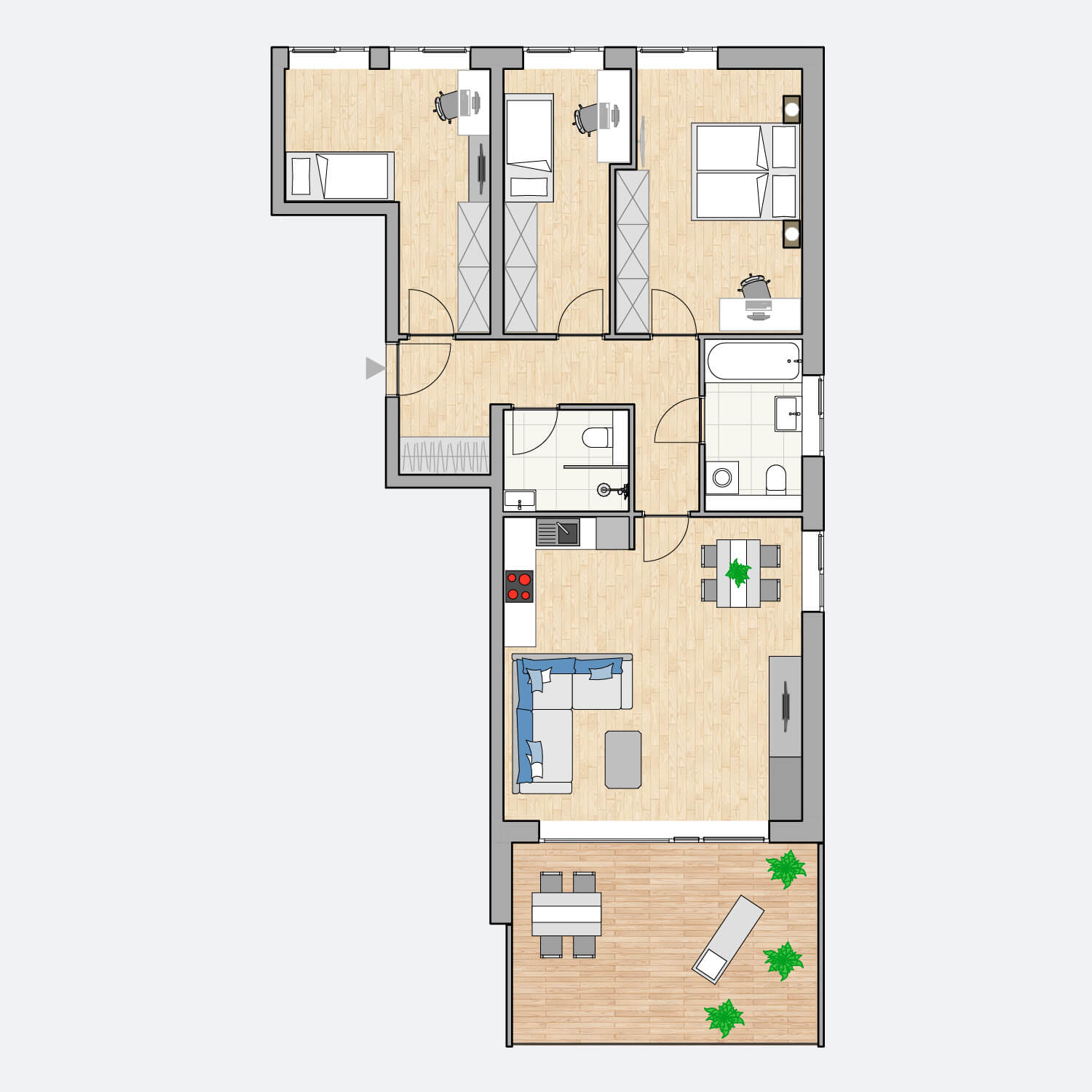 Die Wohnung in der Flößaustraße in Fürth, Einheit 32, bietet eine großzügige und durchdachte Raumaufteilung auf einer Gesamtfläche von 106,08 m². Jeder Raum ist optimal gestaltet, um höchsten Wohnkomfort zu gewährleisten.