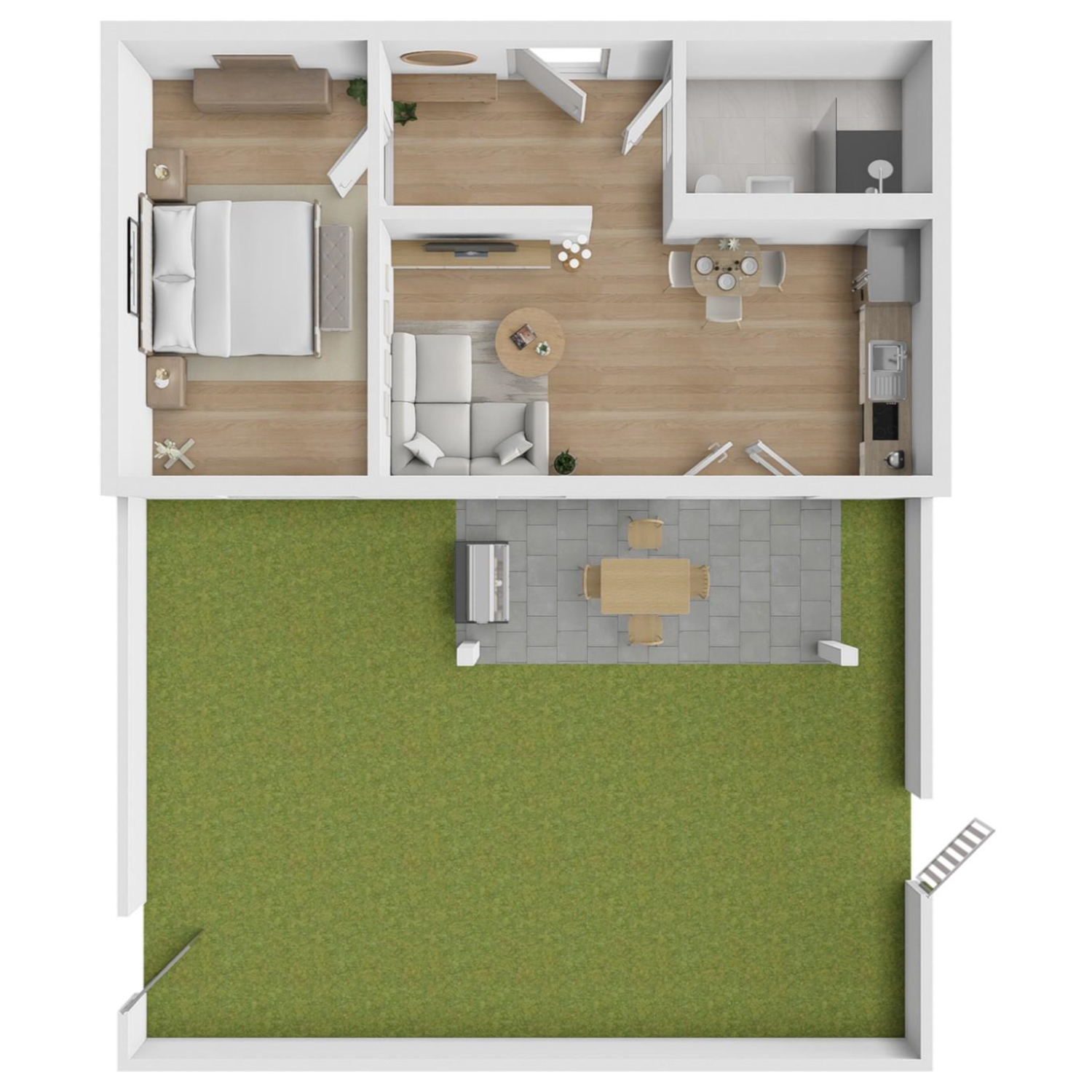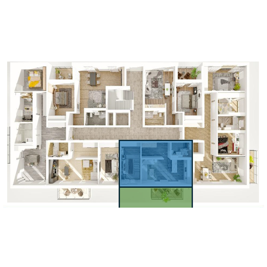 Die Wohnung (WE 4) besticht durch praktische Aufteilung und einen großen Garten mit über 60 m² Grünfläche. Die Wohnfläche beträgt 54,94 m².