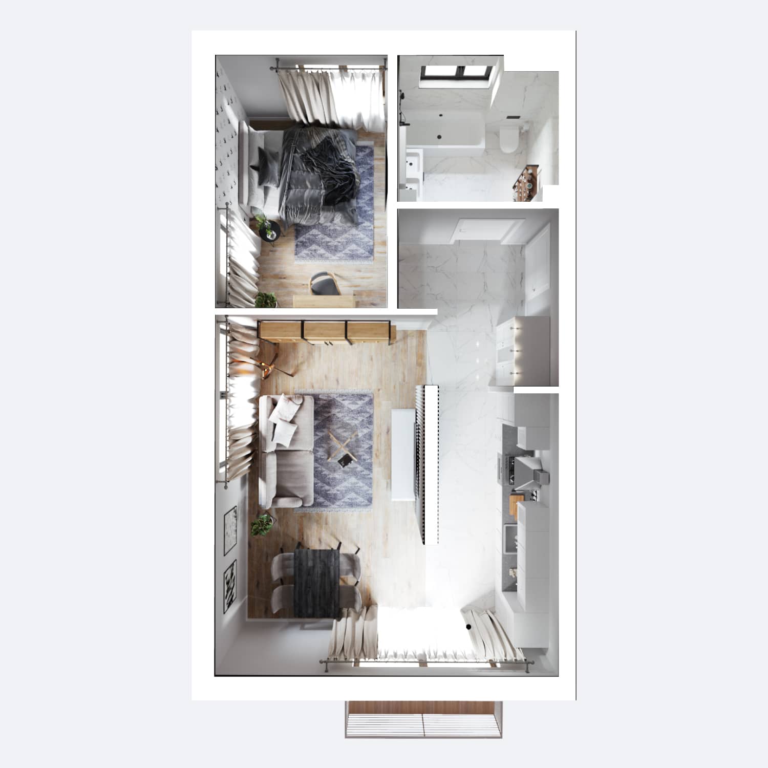 • Schlafen: 11,54 m2 • Bad: 6,14 m2 • Flur: 6,92 m2